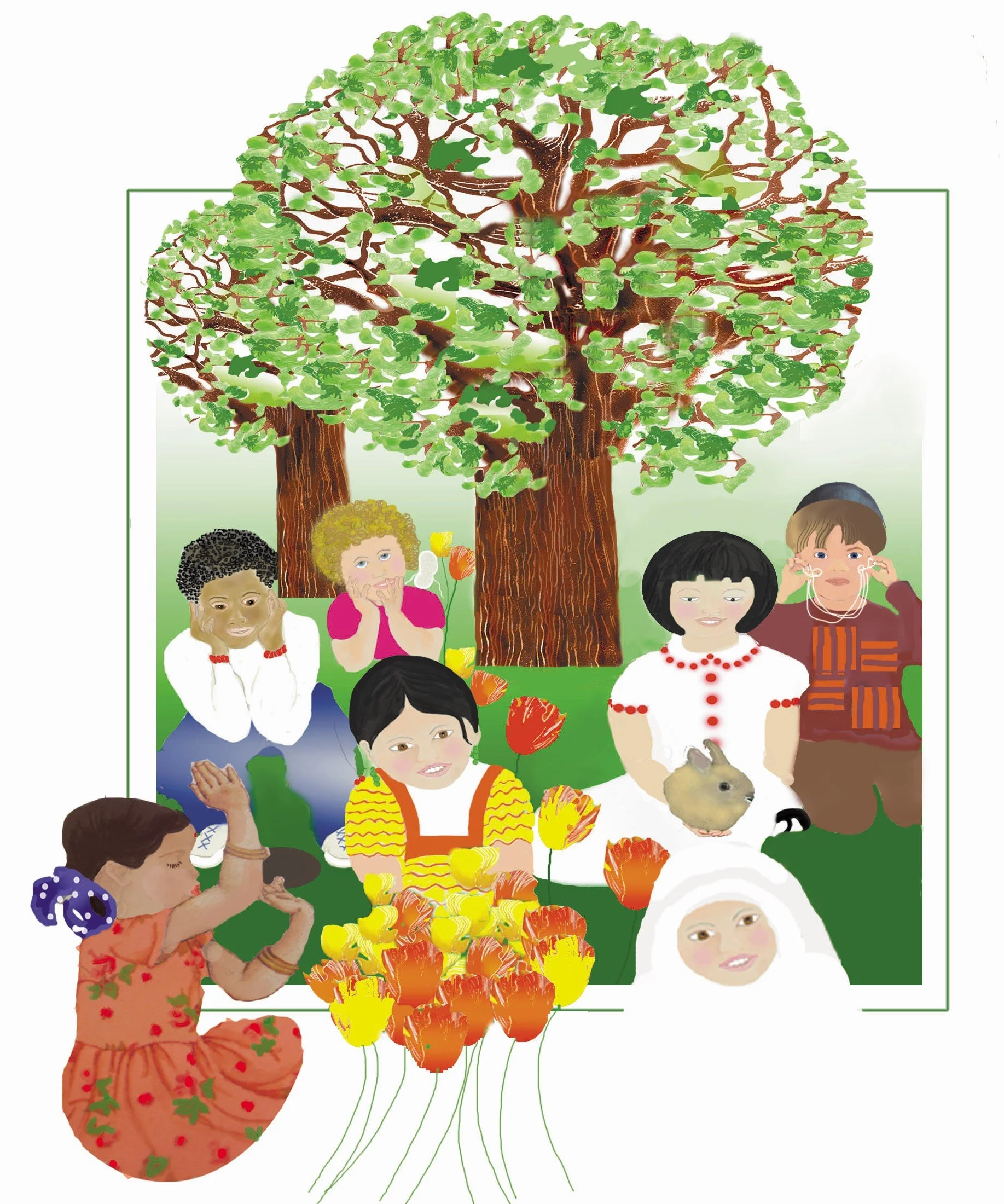 Cherribim, a pretty red dahlia flower, lived in the garden with all of the other flowers. She grew in a soft patch of earth with her special friends – Araminta, Sophenia, Mariel, April, Holly, and Angeline underneath the Great Red Tree. They would watch over the little flowers, the impatience and the pansies and many others.